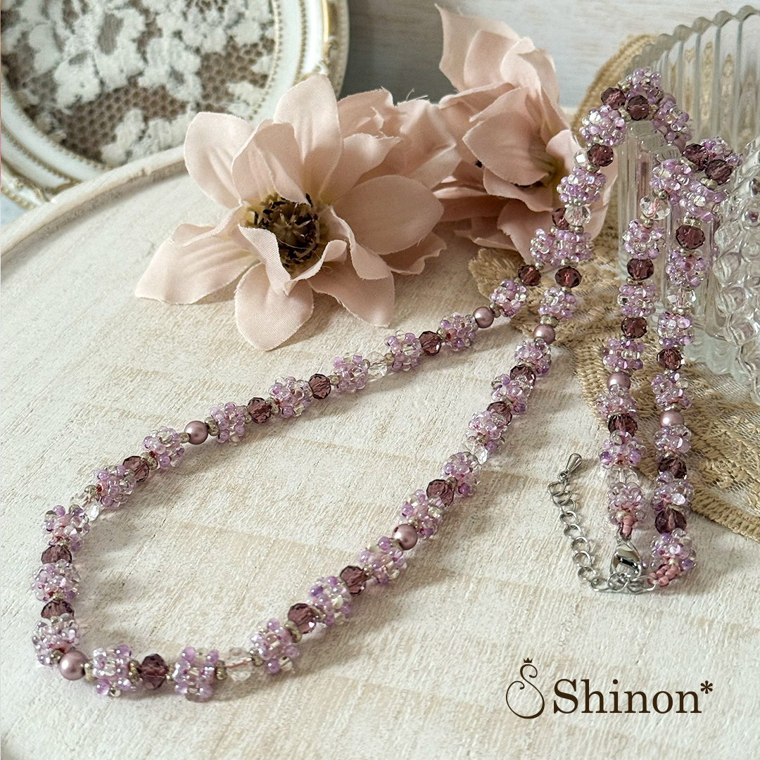 使用材料:クリスタルパール、ガラスビーズ、ファルファーレ、留め具(カニカン、アジャスター)などを使用しています。