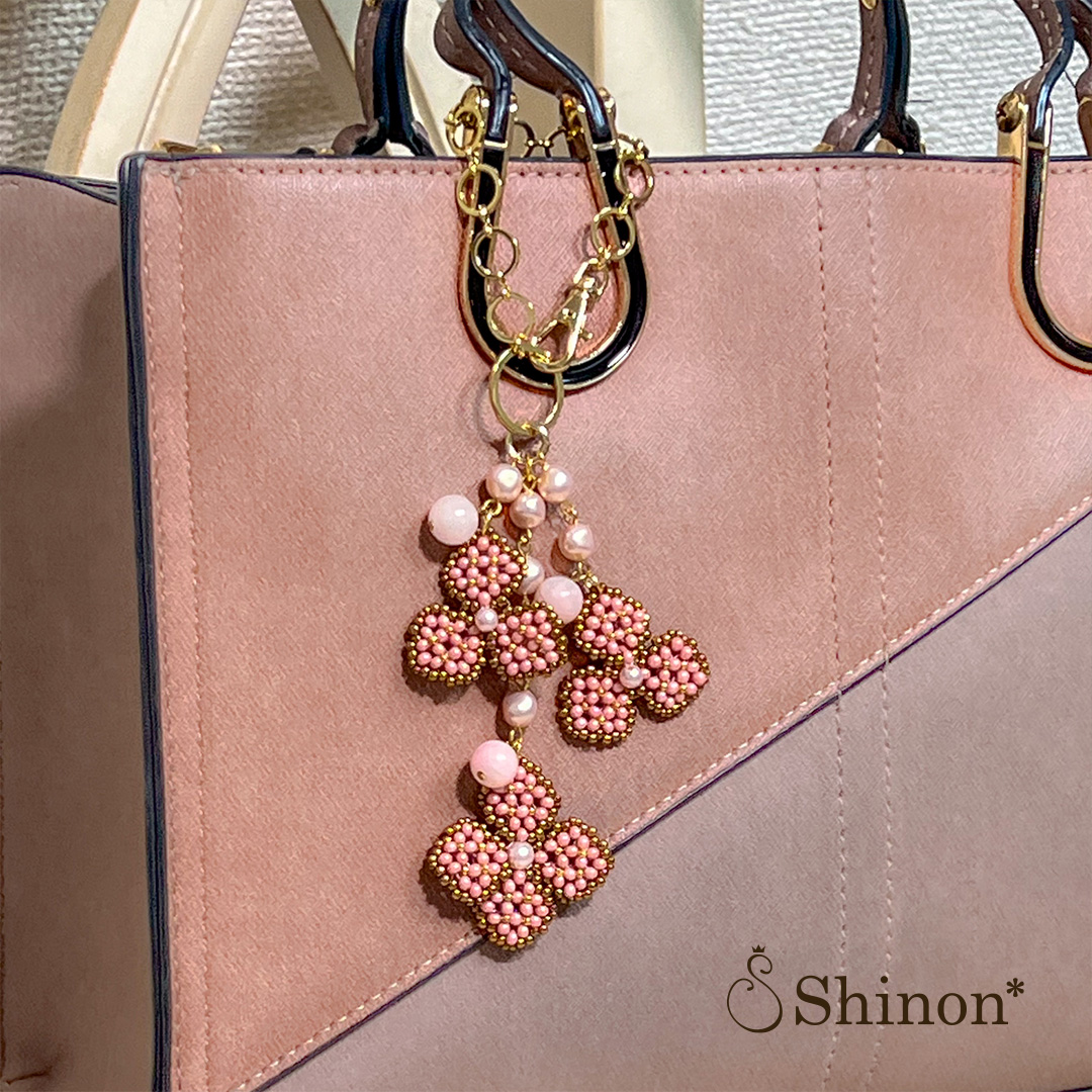 使用素材:シードビーズ、パール、天然石(ローズジェイド)、バッグチャームなどを使用しています。